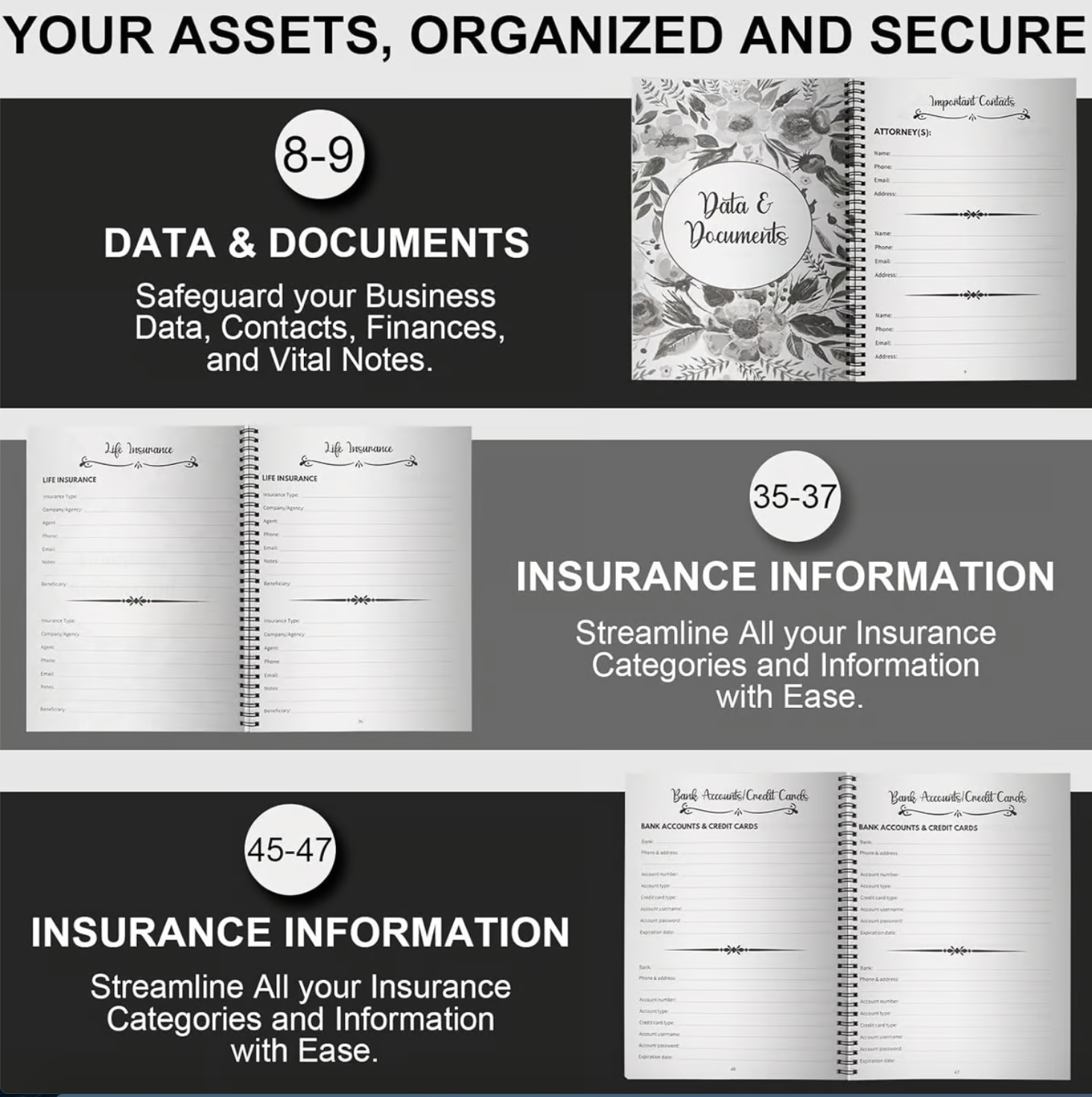 It covers all the information needed after your passing, including your wishes, financial situation, insurance, debts, living will, bills to be paid, accounts to be closed, and more.
