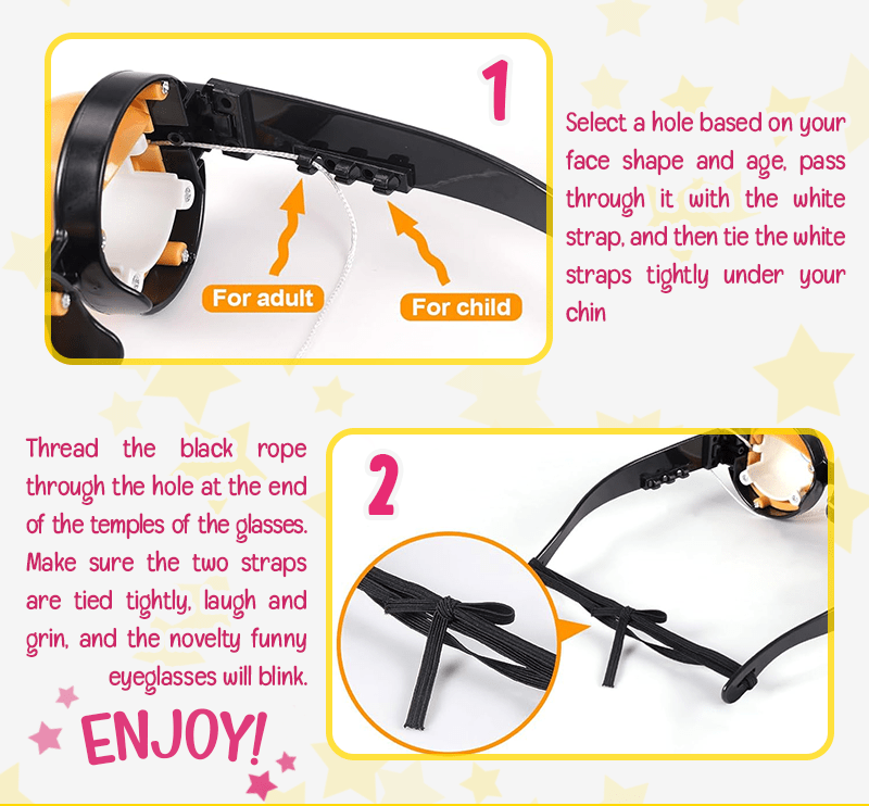 The pull-string blinking eyeglasses come with 3 built-in holes on each side of the eyewear toy’s arms. It lets you adjust the trigger cord according to your comfort fitting to keep it from being too tight to painfully squeeze or too loose to slip off. This fun eye moving sunnies can be also worn for prolonged periods without causing headaches or leaving unsightly marks behind. The perfect eye-catching glasses that can fit for children, teenagers, and adults of both men and women face shapes.