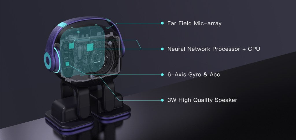 The built-in neural processor and AI models make EMO smart enough for meaningful interactions with people. With a pop culture inspired design, EMO is born with a stylish look, loves headphones and skateboarding.