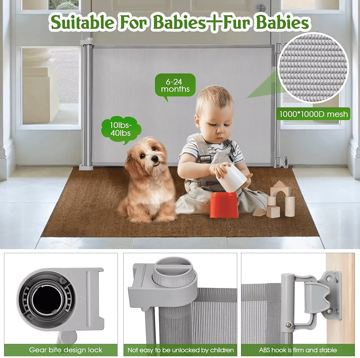 This retractable safety gate is perfect for children and pets, providing a secure barrier for doorways, stairs, and outdoor areas with easy, one-handed operation.
