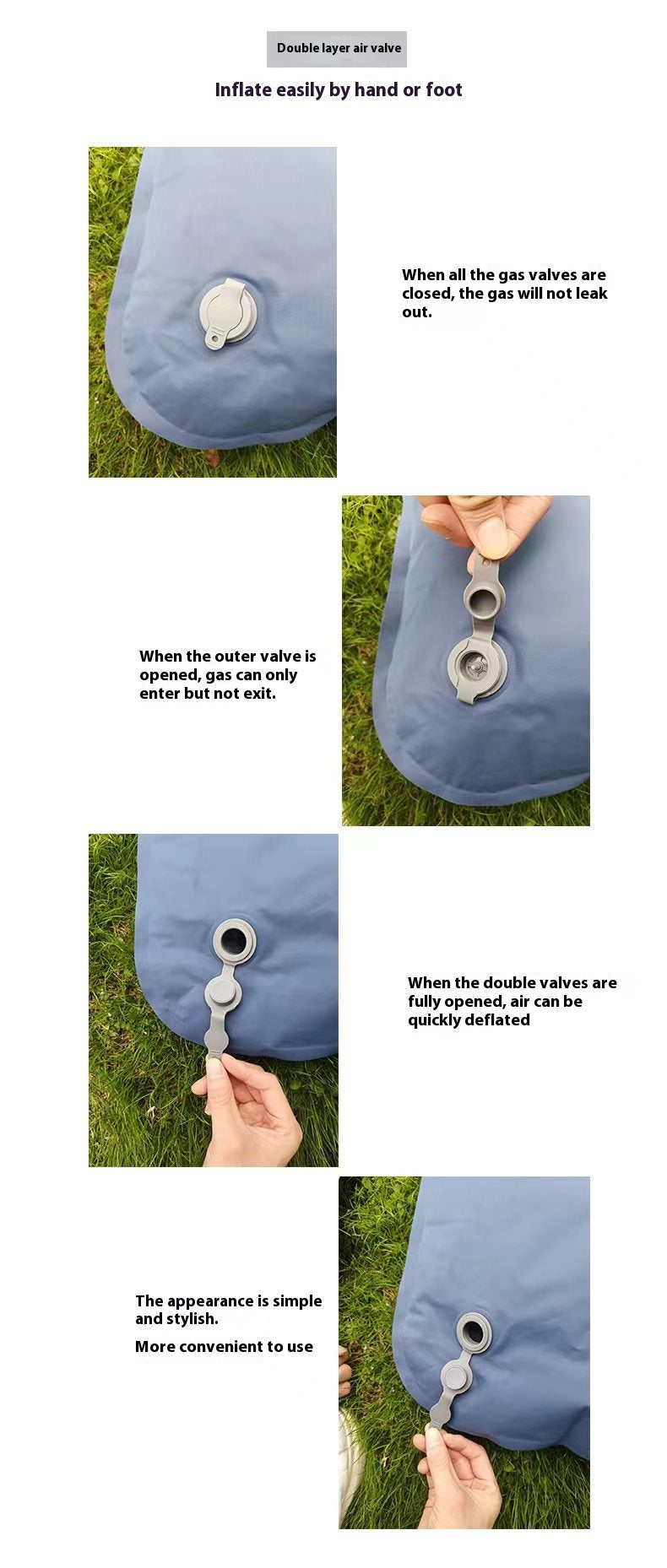 Made from tough, wear-resistant material that withstands pressure and sharp objects, offering long-lasting use. Inflate effortlessly using hand or foot pressure—no pump needed.