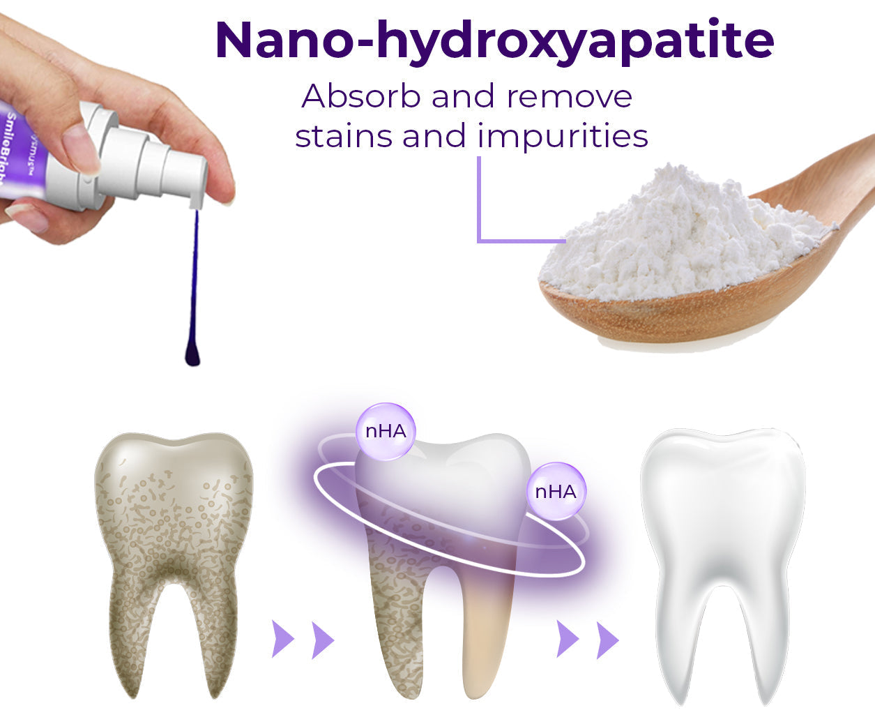 Nano-hydroxyapatite is known for its ability to absorb and remove stains and impurities from teeth. It can effectively whiten teeth by breaking down and removing instant surface stains. This gentle abrasiveness allows it to scrub away extrinsic stains caused by coffee, tea, wine, and other staining substances, improving their gloss and reducing the adherence of stains.