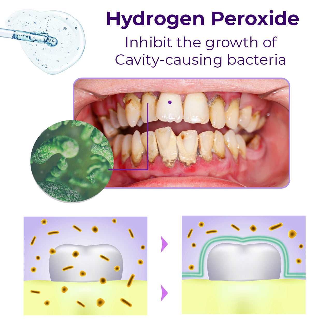 Hydrogen peroxide is a powerful antibacterial agent. Because the buildup of bacteria can lead to teeth discoloration, hydrogen peroxide can help whiten teeth by effectively sterilizing them. It can help inhibit the growth of cavity-causing bacteria, deeply remove bacterial biofilm (plaque) and reduce the production of acid in the mouth, changing tooth brigther.