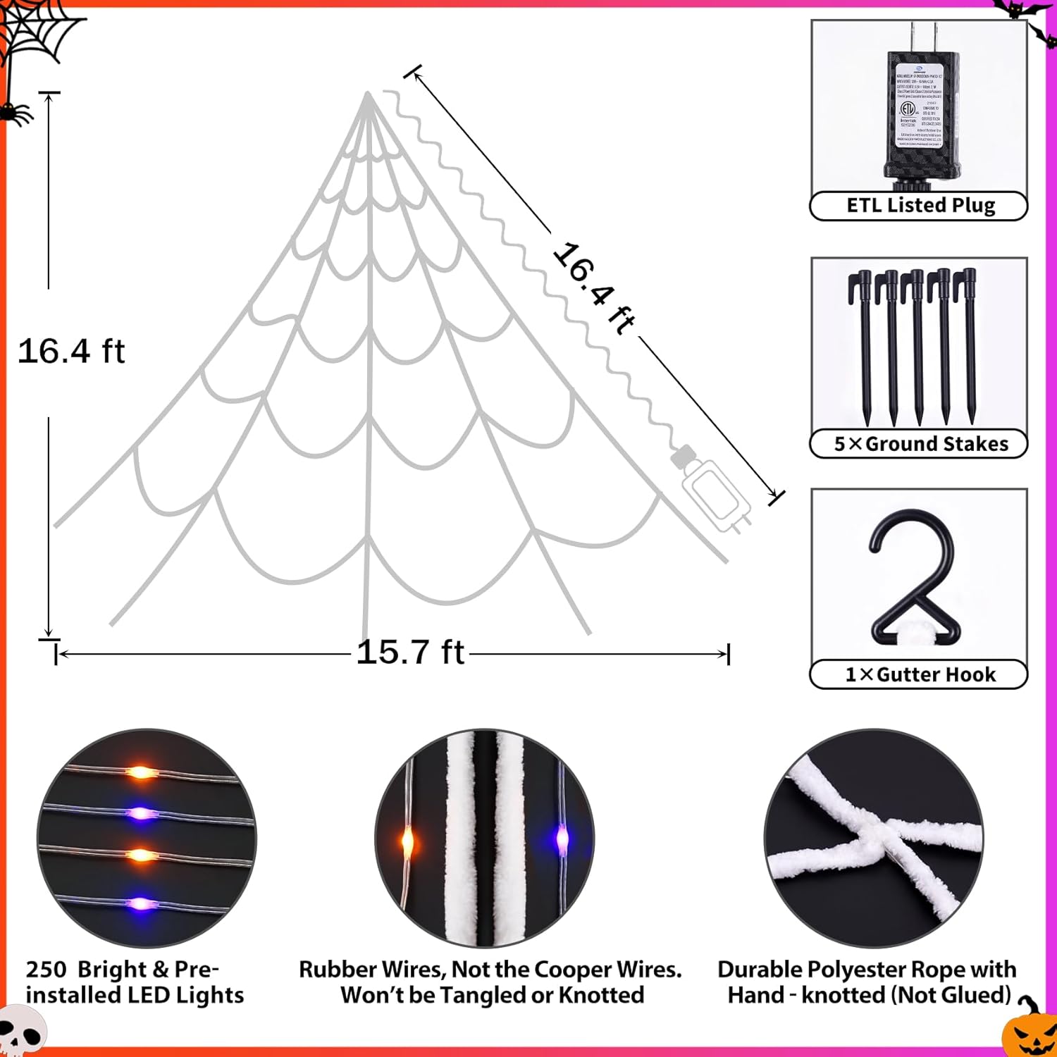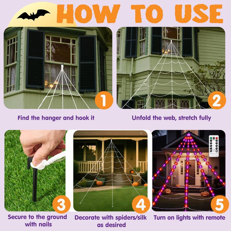 Ideal for yards, porches, trees, lawns, fences, and haunted house parties. Includes 5 ground stakes + 16.4ft lead cord for flexible installation. Just hook the top to a high point (tree limb, gutter, or beam), spread the web, secure it, and let the glowing spider web work its magic.